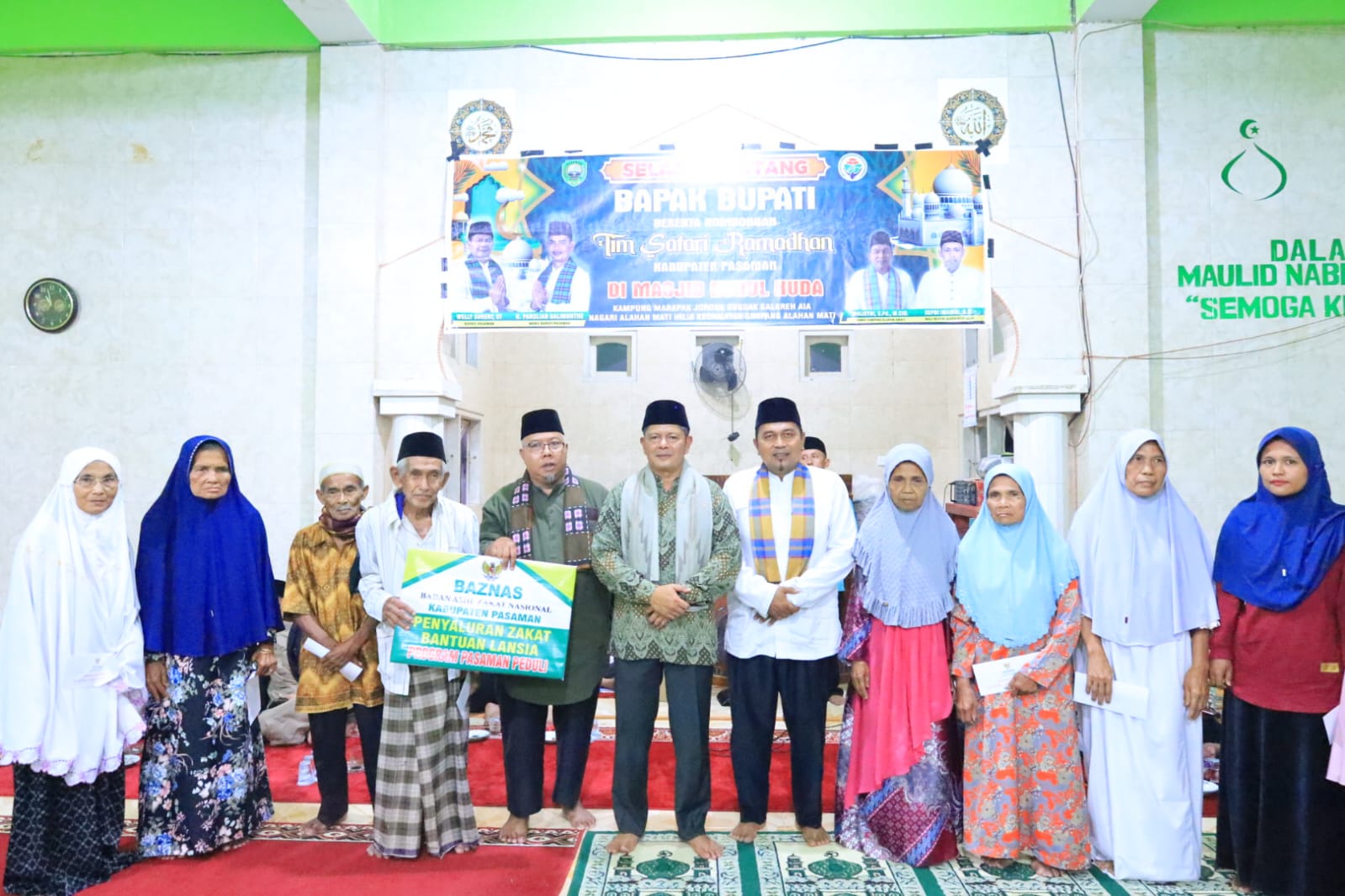 Kemudian, usai pelaksanaan sholat tarwih, juga dilaksanakan penyerahan bantuan Pasaman peduli BAZNAS Pasaman kepada beberapa orang lansia warga setempat oleh Bupati Pasaman Welly Suheri didampingi Pimpinan BAZNAS Pasaman, Kabag Kesra dan Camat Simpati beserta perangkatnya.( Sol )