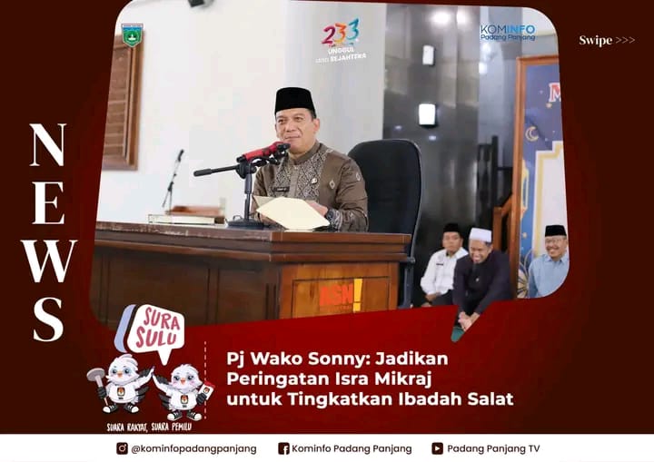 Padang Panjang, zaman.co.id – Pejabat (Pj) Wali Kota, Sonny Budaya Putra, A.P, M.Si, pada sambutannya dalam Tabligh Akbar memperingati Isra ‘ Mikraj, mengimbau kepada ASN dan masyarakat, untuk menjadikan momentum peringatan Isra Mikraj untuk meningkatkan kualitas ibadah, terutama salat.Pesan itu disampaikannya saat memberikan sambutan Tablig Akbar memperingati Isra Mikraj Nabi Muhammad SAW di Masjid Agung Manarul ‘Ilmi Islamic Centre, Rabu ini, 7 februari 2024.