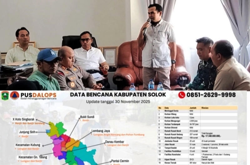 Bencana alam banjir bandang dan tanah longsor yang melanda wilayah Kabupaten Solok sampai dengan Kamis (27/11/2025) berdampak besar pada kerusakan infrastruktur sarana dan prasarana umum dan juga ribuan rumah masyarakat.